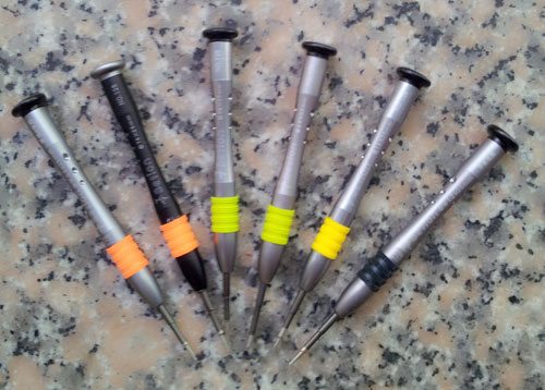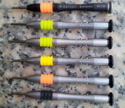 | 0.8 X 25mm(苹果系列手机五角螺丝专用拆机工具) | | 0.6 X 25mm(苹果系列手机三角螺丝专用拆机工具) | | PH000 1.5 X 25mm十字(苹果系列手机十字螺丝专用拆机工具) | | PH00 2.0 X 25mm十字 (国产手机/三星手机十字螺丝刀) | | 1.2 X 25mm(苹果MACBOOK专用拆机工具) | | T5 X 25mm | | T6 X 25mm |