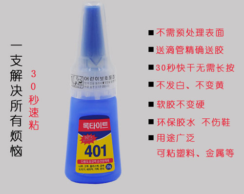 瞬干胶401甲基系列瞬間接著劑,對於乾燥多孔性或酸性表面等困難接著的材料,或在低濕度環境中均可達到快速接著,例如:木材、紙製品、發泡PU、軟木、橡膠、陶瓷等。
