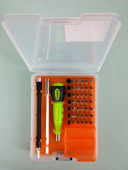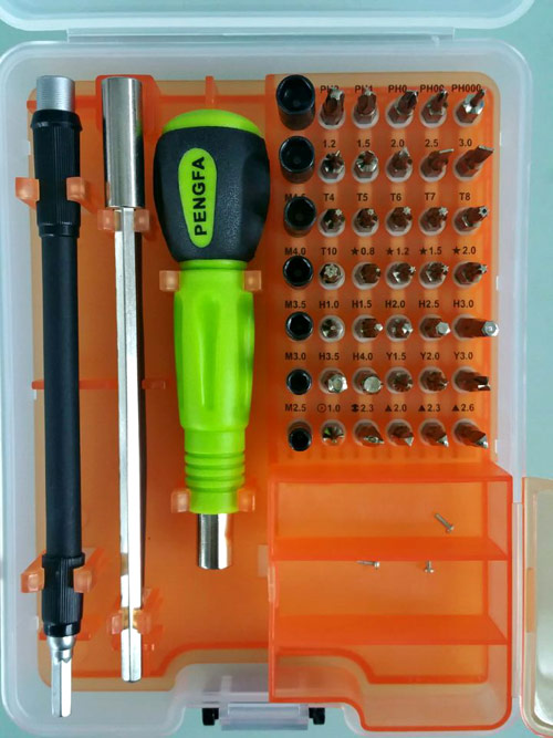 产品功能优点: 1.外盒采用进口塑料胶PP注塑成型,设计美观\实用\携带方便 2.根据人体力学设计的特殊手柄,可根据不同的空间需要进行长度调整 3.易于携带的万向接杆,可在特殊的工作环境下使用 4.规格齐全的精密批嘴,采用高材质铬钒钢(6150#)经过特殊高温处理(硬度HRC52-56) 5.规格齐全的精密批嘴,可适应各种不同领域作业 产品功能使用介绍 1.规格齐全的精密螺丝批嘴,能够适应各种高端手机及电子产品的维修 2.万向角度接杆可在特殊工作环境下使用 3.拆装后的手柄适合在狭小工作环境下使用 4.盒子上黑色片往下推,盒子就可以打开 5.打开盒子盖子,规格齐全精密起子可以选择 6.内置精致元件盒可以收集电子元件和细小螺丝 | 内装部件: | | T4 T5 T6 T7 T8 T10 螺丝刀 | | PH000 PH00 PH0 PH1 PH2 十字螺丝刀 | | 1.2 1.5 2.0 2.5 3.0 一字螺丝刀 | | M2.5 3.0 3.5 4.0 4.5 5.0 5.5 套筒 | | H1.0 1.5 2.0 2.5 3.0 3.5 4.0 螺丝刀 | | 1.0 圆头,M2.3 叉批 | | 五角0.8 1.2 1.5 2.0 螺丝刀 | 实心 2.0 2.3 2.6 螺丝刀 | | 三角1.5 2.0 3.0 螺丝刀 | | 加长杆 | | 万向导杆 | | 鑷子 |