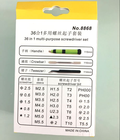 | 内装部件: | | 1、T2 T3 T4 T5 T5.5 T6 T8 T10 批 | | 2、1.5 2.0 十字批 | | 3、1.5 2.0 一字批 | | 4、2.3实心三角批 | | 5、0.8 1.2 五角批 | | 6、2.0 2.5三角批 | | 7、H1.5 2.0 2.5 3.0 U2.3 +2 | | 8、M2.5 3.0 3.5 4.0 4.5 5.0 5.5 套筒 | | 9、2.5 IP6S 中板螺丝刀 | | 10、0.6 Y IP7 中板螺丝刀 | | 11、金属双头撬棒 | | 12、吸盘、拆机三角片 | | 13、镊子 |